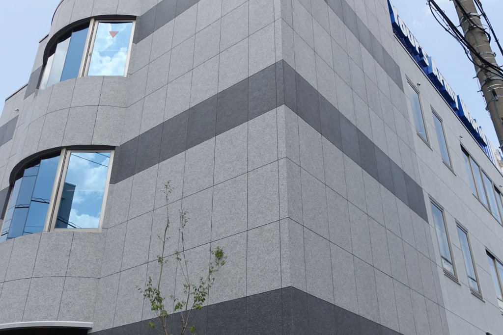 施工後の成果 御影石JB調を通し目地で施工させていただき、スタイリッシュでモダンな建物になりました。
