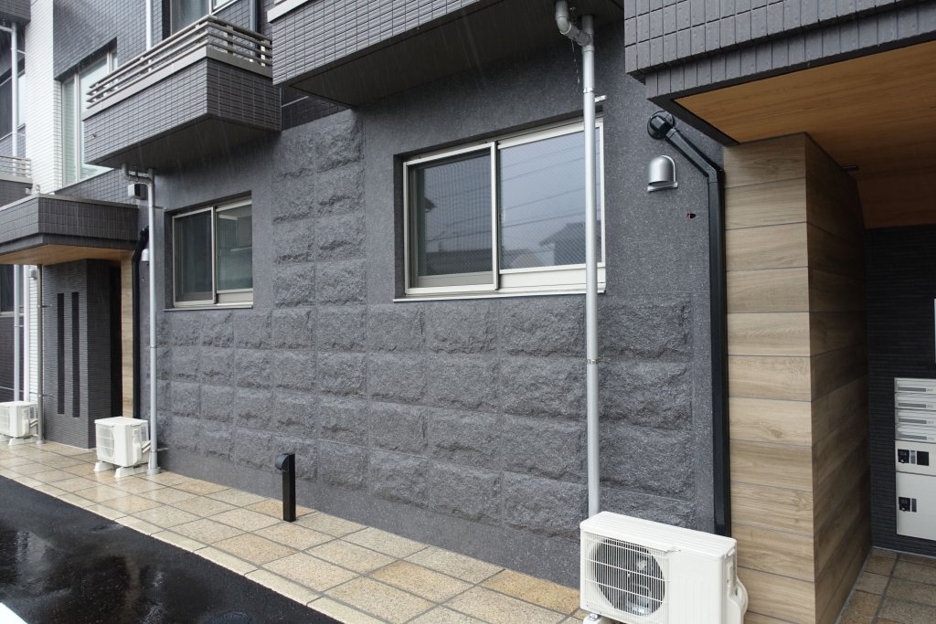 こぶ出し石調の重厚感のあるインパクトと木目調の温かみにより、高級感溢れるモダンな印象を演出することが出来ました。