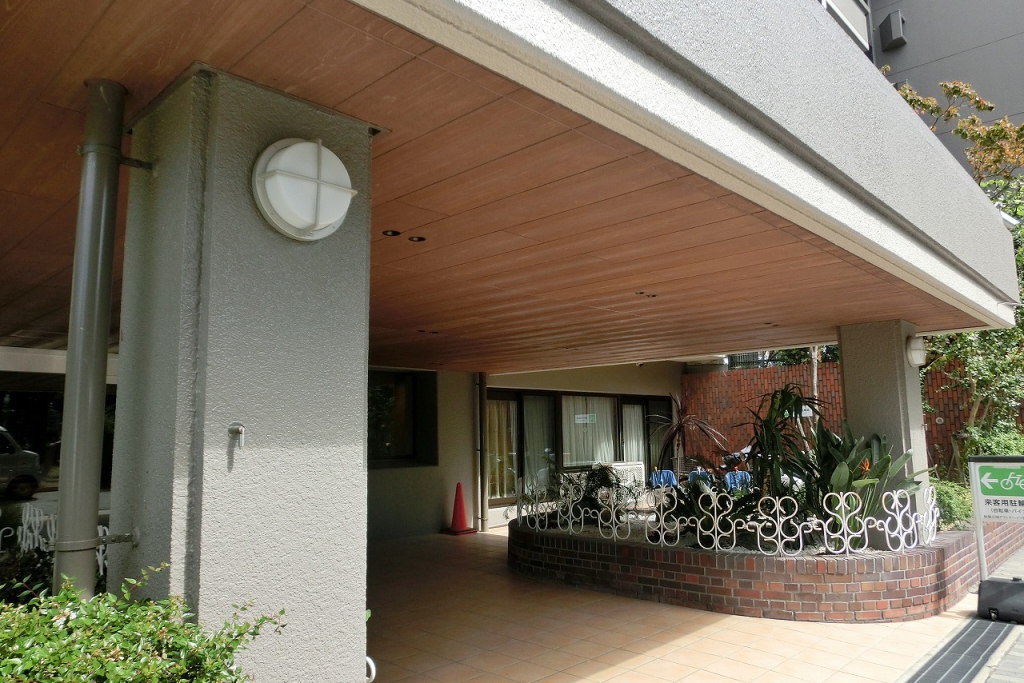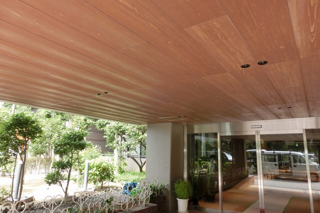 エントランスポーチに施工されている木目調のボードのビス穴の補修跡が目立つということでご相談いただきました。