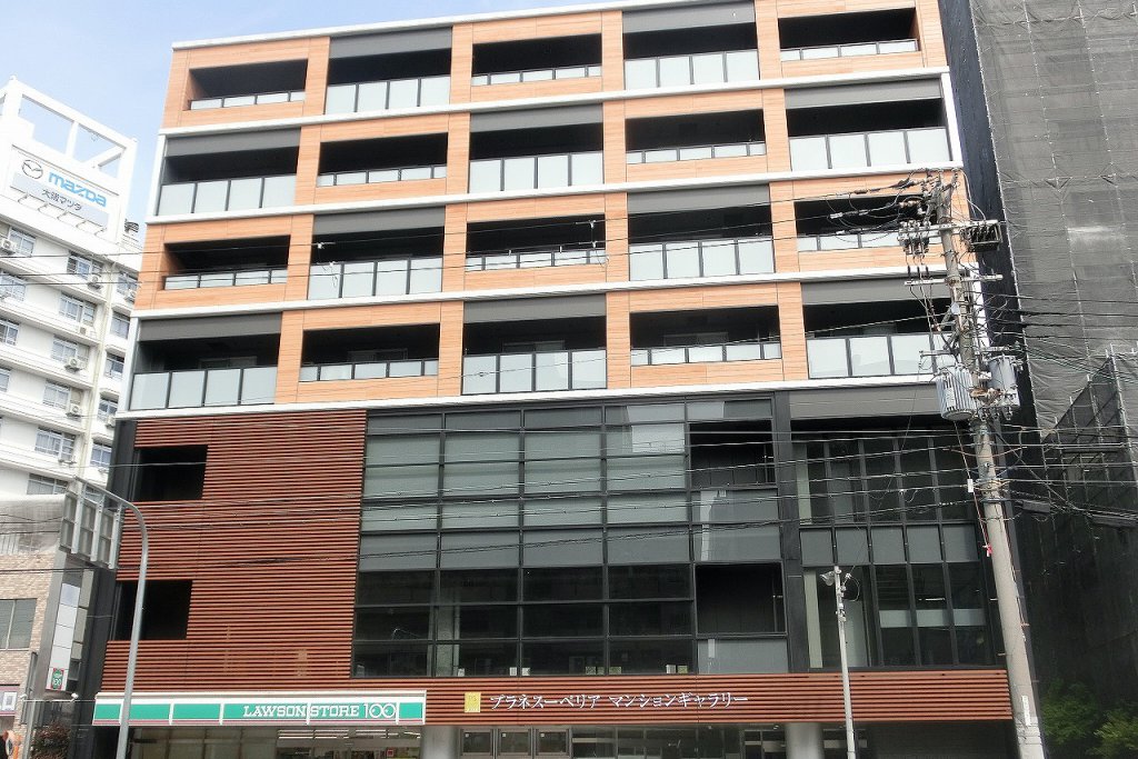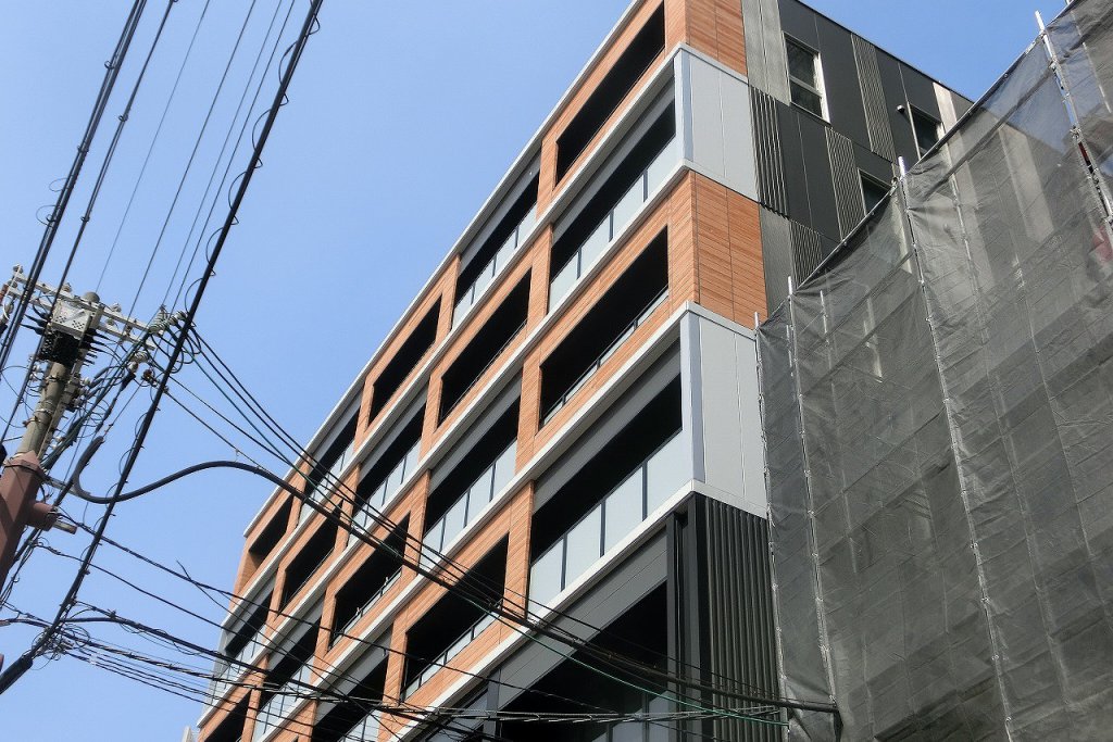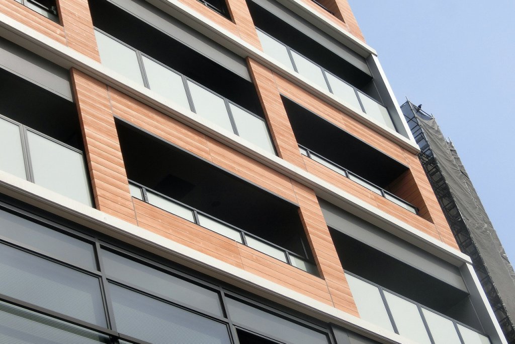建物のファサードに木目を使用したいということで、天然木か木目調マハールかで悩まれていました。