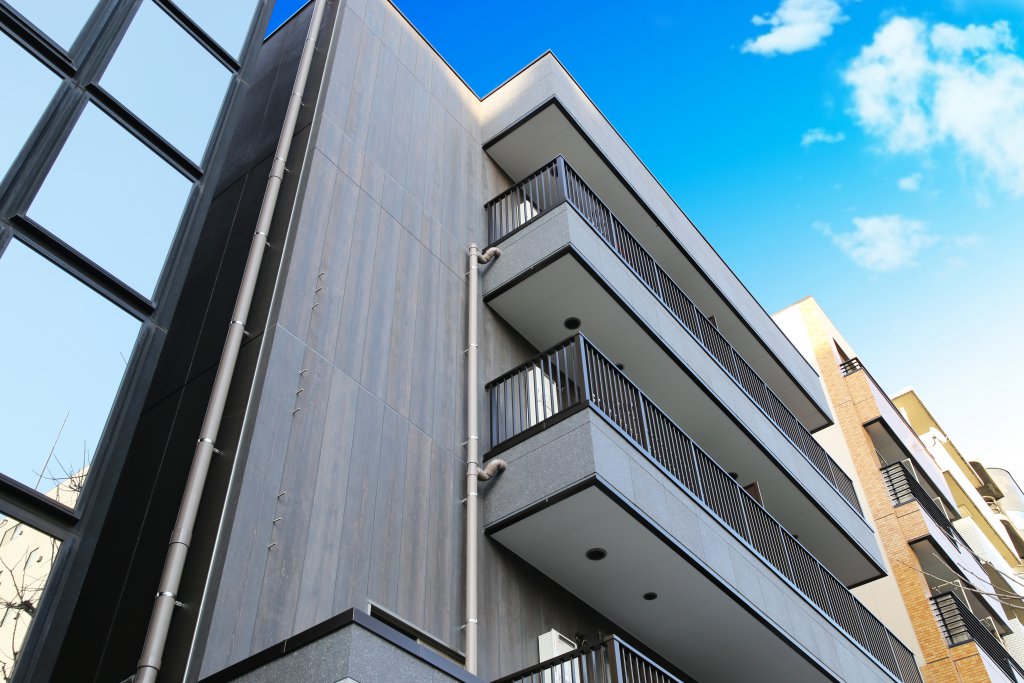 施工内容 ALC目地処理・下地調整の上、御影石ジェットバーナー調のアーグラと天然木の豊かな風合いをそのままに再現した木目調マハールを施工しました。