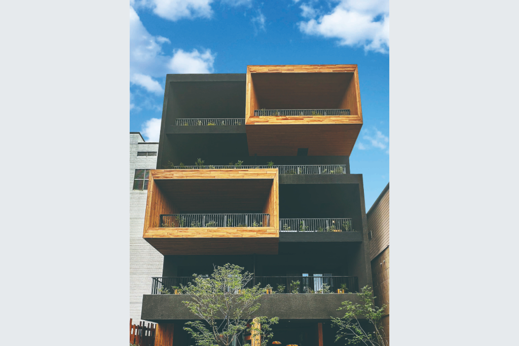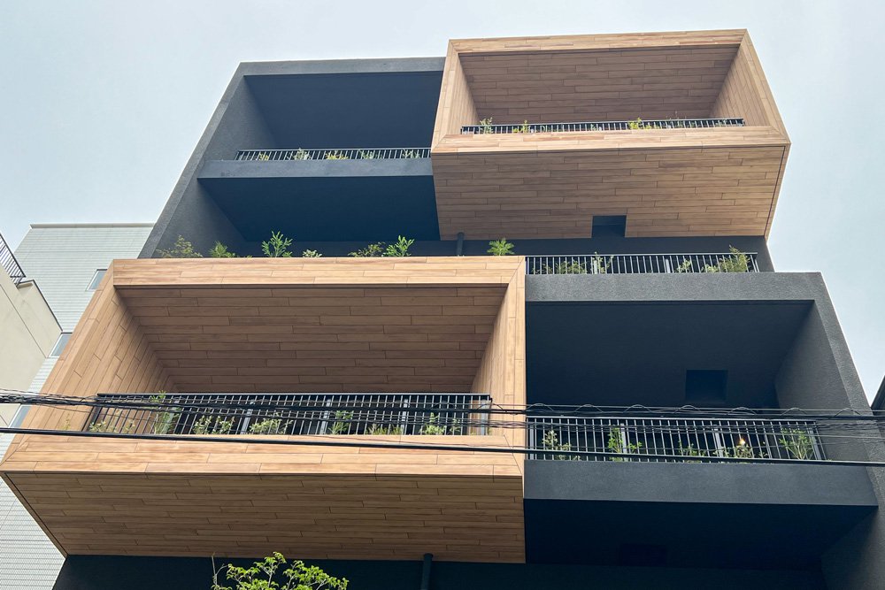 木目調マハールは外部に使用でき、メンテナンスが天然木と比べて容易なところと、他の仕上げにはない木目のリアルな風合いがあるため採用に至りました。
