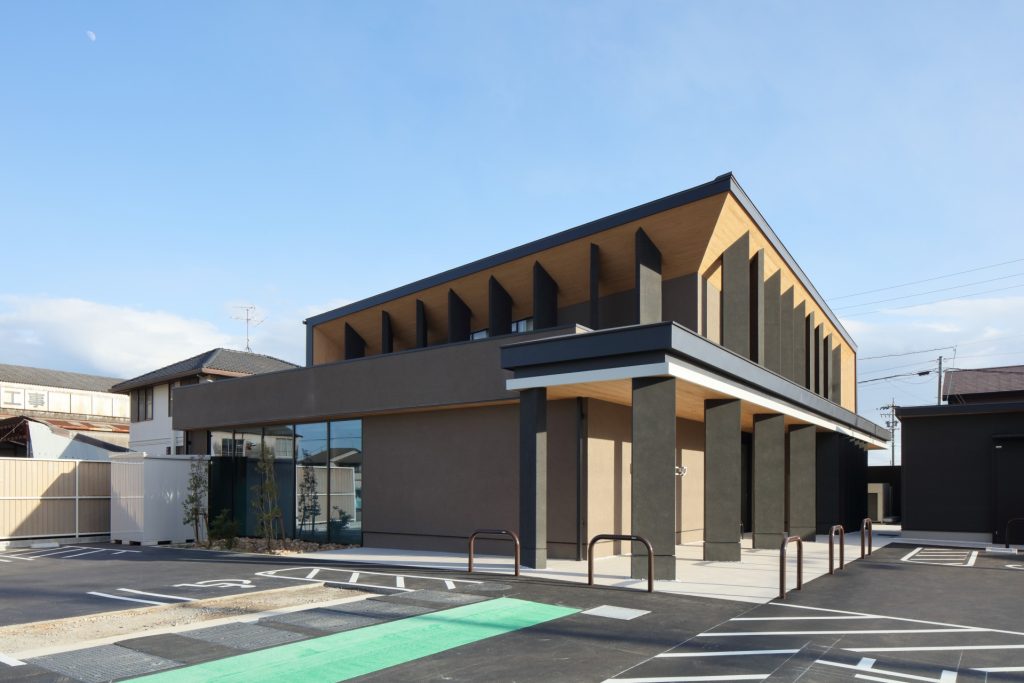 複雑な斜め勾配の軒天と多角的な柱型を融合させたデザインを実現するため、優れた施工性と高い意匠性を兼ね備えた木目調マハールを採用しました。