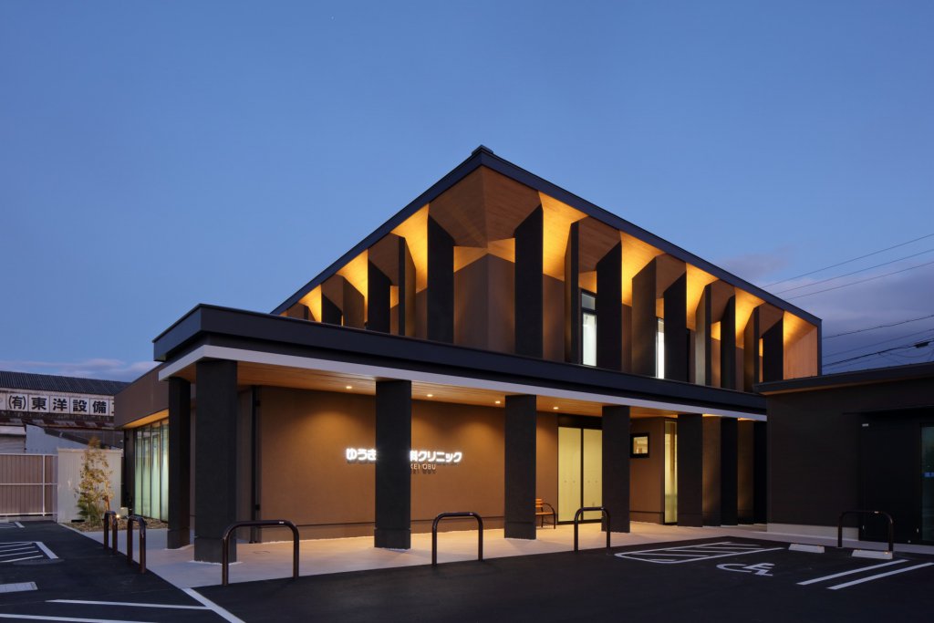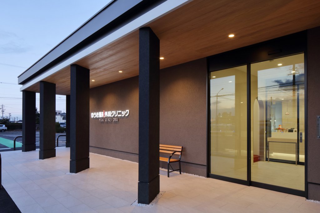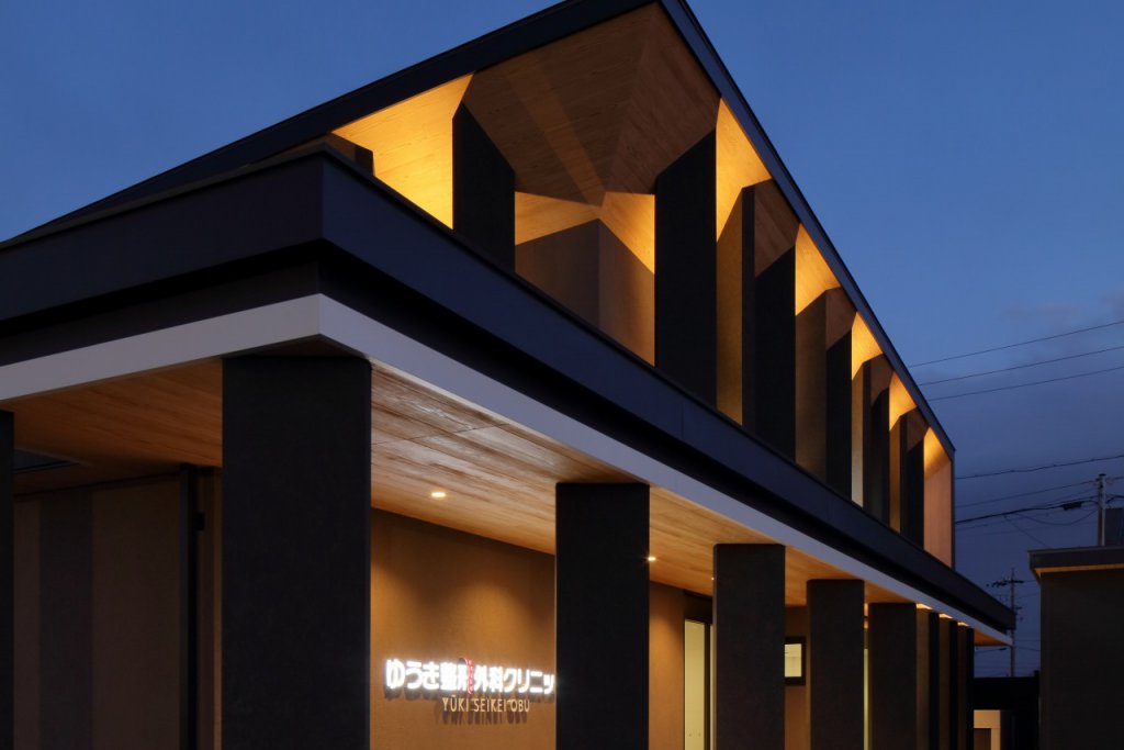 木目調の自然な質感と効果的に配置された軒天とシックな柱型の組み合わせにより、昼間は木の温もりを感じさせる空間に、夜間は設置された照明が木目の表情を引き立て、印象的なシルエットを創出しています。