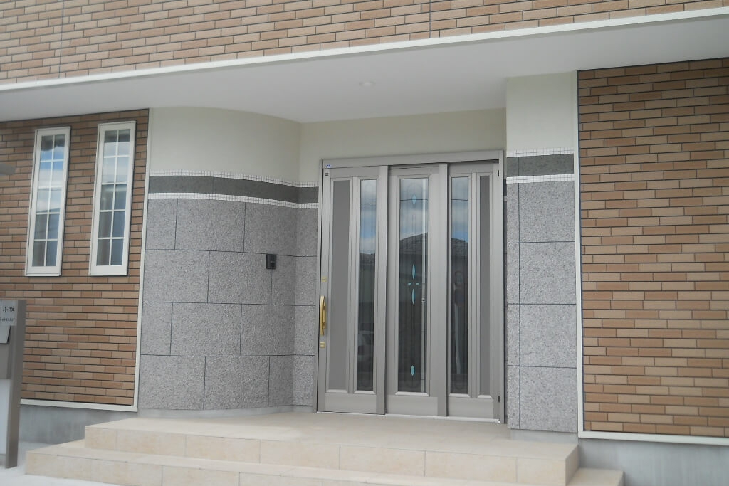 新築の玄関廻りを曲面で豪華にしたいためにニューガンダーラ(たたき石調)を施工。