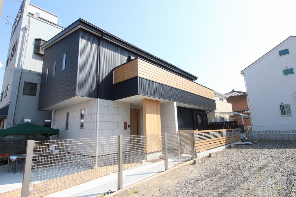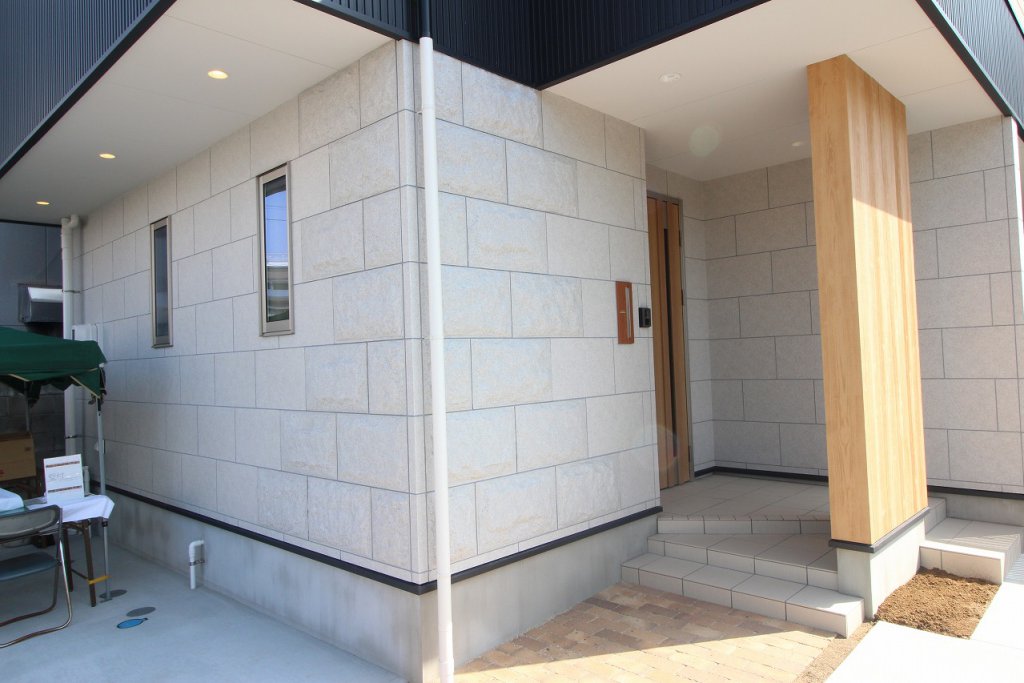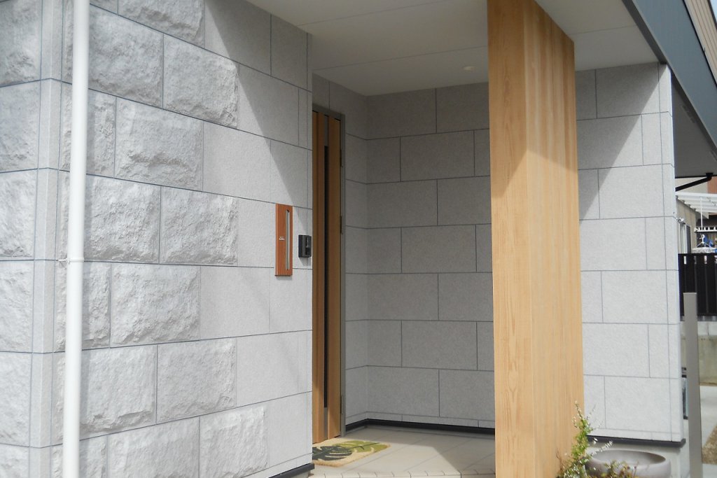 お施主様は、玄関廻りに高級感のある仕上げを要望されていました。 しかし本石の場合にはコストや重量が心配です。 そこで本石よりも非常に軽量で、重厚感もあるこぶ出し石調マハールをご提案いただき、ご採用いただきました。