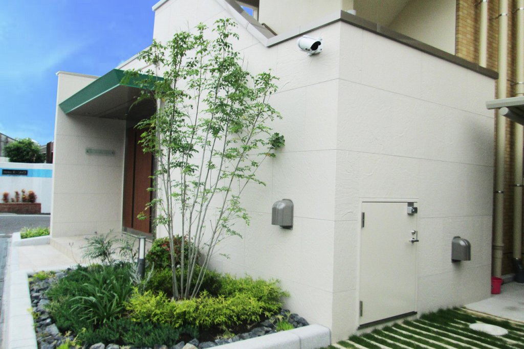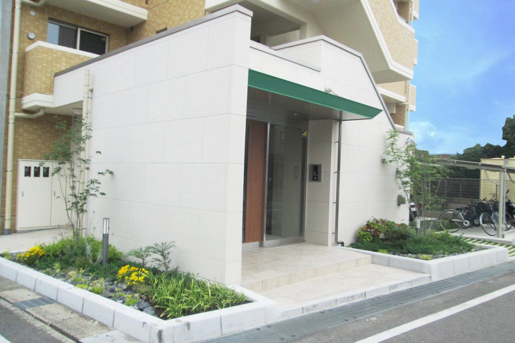 マンションの顔であるエントランス部は白を基調にし、本石で高級感を出したいとのことでした。